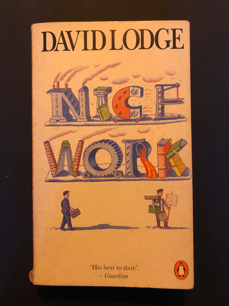 The summer of 1989 was a massive turning-point in my life. I’d just finished my GCSEs, and twelve weeks of freedom stretched in front of me before the start of A levels. I could have got a part-time job, but part-time jobs were in short supply in Merseyside in 1989, and anyway, I had other ideas. I wanted to read. We’d been told, at our A level English Literature induction session, that we should try to read as much as possible over the summer, and had been given some names of authors to try: Margaret Atwood, Ian McEwan, Julian Barnes. I couldn’t find any of them in either of the bookshops near us, but I did find a book I’d seen reviewed in the newspaper a few days earlier. It had a reassuring orange Penguin spine and its title, Nice Work, was made up of cartoonish images: factory chimneys, a cog and a crane, artfully-arranged books. There was a suited man with a briefcase and a short-haired woman carrying a placard. Hmmm. I decided to give it a go.